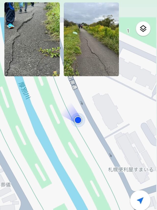 先日、清田地区町内会連合会の歩く運動で皆さんと一緒に歩いた時のこと、河川敷には昨年には無かった『2つの陥没と道の隆起』が比較的近いエリア内にありました。